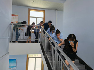 理論培訓(xùn)后進(jìn)行火災(zāi)疏散演練,參加培訓(xùn)人員在楊教官的指引下,用濕毛巾捂住口鼻,彎腰貼墻迅速有序通過安全出口,奔向辦公樓前空地集合。